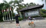 Pesepeda berfoto di depan papan  kawasan Candi Borobudur, Magelang, Jawa Tengah, Ahad (7/2).  (FOTO : Wihdan Hidayat / Republika)