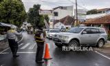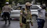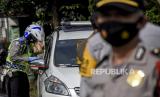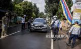 Petugas gabungan menghentikan kendaraan saat operasi penyekatan dan pemeriksaan di perbatasan Kabupaten Bandung dengan Kota Bandung di Jalan Ir H Juanda, Kecamatan Cimenyan, Kabupaten Bandung, Ahad (7/2). (FOTO : ABDAN SYAKURA/REPUBLIKA)