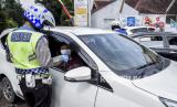 Anggota Satlantas Polresta Bandung memeriksa identitas serta surat keterangan sehat saat operasi penyekatan dan pemeriksaan di perbatasan Kabupaten Bandung dengan Kota Bandung di Jalan Ir H Juanda, Kecamatan Cimenyan, Kabupaten Bandung, Ahad (7/2). (FOTO : ABDAN SYAKURA/REPUBLIKA)