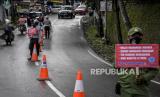 Petugas gabungan memutar balik kendaraan dari luar daerah saat operasi penyekatan dan pemeriksaan di perbatasan Kabupaten Bandung dengan Kota Bandung di Jalan Ir H Juanda, Kecamatan Cimenyan, Kabupaten Bandung, Ahad (7/2). (FOTO : ABDAN SYAKURA/REPUBLIKA)