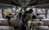 Petugas gabungan memberikan imbauan protokol kesehatan ke penumpang bus saat operasi penyekatan dan pemeriksaan di perbatasan Kabupaten Bandung dengan Kota Bandung di Jalan Ir H Juanda, Kecamatan Cimenyan, Kabupaten Bandung, Ahad (7/2). (FOTO : ABDAN SYAKURA/REPUBLIKA)