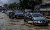 Sejumlah kendaraan melewati genangan air saat terjadi banjir di Jalan Jatinegara Barat, Jakarta, Senin (8/2). Banjir yang menggenangi badan jalan mencapai 20 cm tersebut diakibatkan luapan sungai Ciliwung yang dipicu tingginya curah hujan sejak dini hari. (FOTO : Republika/Putra M. Akbar)