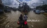 Warga melintasi genangan air saat terjadi banjir di Jalan Jatinegara Barat, Jakarta, Senin (8/2). Banjir yang menggenangi badan jalan mencapai 20 cm tersebut diakibatkan luapan sungai Ciliwung yang dipicu tingginya curah hujan sejak dini hari. Republika/Putra M. Akbar (FOTO : Republika/Putra M. Akbar)