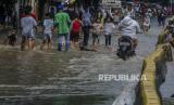 Anak-anak bermain saat terjadi banjir di Jalan Jatinegara Barat, Jakarta, Senin (8/2). Banjir yang menggenangi badan jalan mencapai 20 cm tersebut diakibatkan luapan sungai Ciliwung yang dipicu tingginya curah hujan sejak dini hari. (FOTO : Republika)