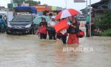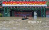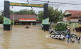 REPUBLIKA.CO.ID, INDRAMAYU -- Seorang personel TNI menerobos banjir yang merendam Koramil 1611/Losarang, di desa Puntang, Losarang, Indramayu, Jawa Barat, Senin (8/2/2021).