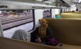 Penumpang berada di dalam Kereta Api (KA) Kahuripan saat transit di Stasiun KA Madiun, Jawa Timur, Senin (8/2/2021). PT KAI akan memberlakukan Grafik Perjalanan KA (Gapeka) 2021 mulai 10 Februari antara lain karena telah difungsikannya sebagian jalur ganda, sehingga terjadi percepatan waktu tempuh dan peningkatan jumlah perjalanan KA penumpang dari sebelumnya 1.838 perjalanan KA per hari naik tiga persen dibandingkan Gapeka 2019 dengan 1.785 perjalanan KA per hari dan KA barang 328 perjalanan KA naik empat persen dibanding Gapeka 2019 dengan 316 perjalanan per hari. (FOTO : ANTARA/Siswowidodo)