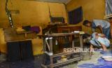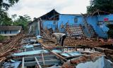 Warga membersihkan material bangunan sekolah yang ambruk akibat pergerakan tanah di Desa Girimukti, Singajaya, Kabupaten Garut, Jawa Barat, Senin (8/2/2021). Pergerakan tanah tersebut mengakibatkan sejumlah bangunan seperti ruang kelas, bangunan kantor desa, sarana olahraga desa, beberapa rumah warga retak dan ambruk. (FOTO : ANTARA/Candra Yanuasryah)