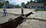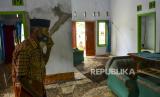 Warga menunjukkan bangunan yang terdampak pergerakan tanah di Desa Girimukti, Singajaya, Kabupaten Garut, Jawa Barat, Senin (8/2/2021). Pergerakan tanah tersebut mengakibatkan sejumlah bangunan seperti ruang kelas, bangunan kantor desa, sarana olahraga desa, beberapa rumah warga retak dan ambruk. (FOTO : ANTARA/Candra Yanuasryah)