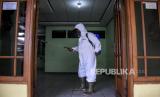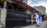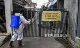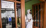 Warga menyemprotkan cairan disinfektan di Rumah Singgah Covid-19 RW 06 di Jalan Cikampek, Antapani, Kota Bandung, Rabu (10/2). Warga RW 06 Kelurahan Antapani mengubah rumah kosong milik warga setempat menjadi rumah singgah bagi keluarga dari pasien yang terpapar Covid-19 yang sedang menjalani isolasi mandiri di rumah. (FOTO : ABDAN SYAKURA/REPUBLIKA)