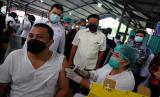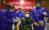 Perwakilan Muspida dari TNI menjalani penyuntikkan vaksin COVID-19 Sinovac saat vaksinasi tahap pertama di Rumah Sakit Kesrem, Lhokseumawe, Aceh. Rabu (10/2/2021). Vaksinasi perdana tersebut menandai dimulainya program vaksinasi COVID-19 dan selanjutnya dilakukan vaksinasi pada 4.603 orang tenaga kesehatan dan SDM Kesehatan di daerah itu. (FOTO : ANTARA/Rahmad)