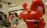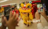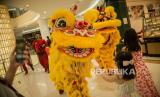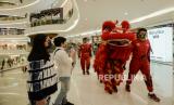 Atraksi Barongsai di depan pengunjung di salah satu pusat perbelanjaan di Jakarta, Jumat (12/2). Atraksi barongsai tersebut digelar guna menghibur pengunjung  dalam rangka menyambut Tahun Baru Imlek 2021. (FOTO : Republika/Thoudy Badai)