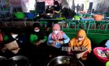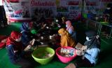 Sejumlah relawan membungkus makanan untuk dibagikan pengungsi dan petugas di dapur umum tanah longsor di Ngetos, Nganjuk, Jawa Timur, Senin (15/2/2021). Dapur umum tersebut dibuka untuk membantu menyediakan makanan bagi pengungsi tanah longsor dan petugas serta tim SAR yang bertugas. (FOTO : Zabur Karuru/ANTARA )