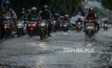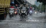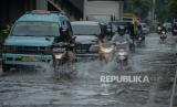 Pengendara harus melintasi genangan air di jalan protokol Yos Sudarso, Sunter, Jakarta Utara. Genangan setinggi 20-40 sentimeter tersebut akibat luapan saluran darinase setelah curah hujan tinggi pada pagi hari.