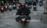 Pengendara melintasi genangan air di jalan protokol Yos Sudarso, Sunter, Jakarta Utara, Selasa (16/2). (FOTO : Republika/Thoudy Badai)