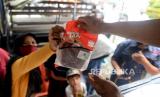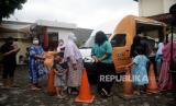 Sejumlah warga mengantri daging di pada acara Food Truck Daging Goes to Kelurahan di Kelurahan Pisangan Baru, Jakarta, Rabu (17/2). (FOTO : Prayogi/Republika.)