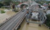 Foto udara progres perbaikan pembangunan jembatan pantura perbatasan Kabupaten Pemalang dan Kabupaten Pekalongan di Kabupaten Pekalongan, Jawa Tengah, Rabu (17/2/2021). Pemerintah Jateng menargetkan pada akhir Februari pembangunan jembatan tersebut dapat selesai dengan progres saat ini mencapai 40 persen dengan pengerjaan dikerjakan 24 jam. (FOTO : ANTARA/Harviyan Perdana Putra)