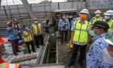 Gubernur Jawa Tengah Ganjar Pranowo (kedua kanan) didampingi Bupati Pekalongan Asip Kholbihi (kanan) berbincang saat meninjau perbaikan pembangunan jembatan pantura perbatasan Kabupaten Pemalang dan Kabupaten Pekalongan di Kabupaten Pekalongan, Jawa Tengah, Rabu (17/2/2021). Pemerintah Jateng menargetkan pada akhir Februari pembangunan jembatan tersebut dapat selesai dengan progres saat ini mencapai 40 persen dengan pengerjaan dikerjakan 24 jam. (FOTO : ANTARA/Harviyan Perdana Putra)