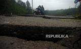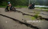 Pengendara motor melewati jalan yang retak dan amblas di Desa Kalibakung, Kabupaten Tegal, Jawa Tengah, Rabu (17/2/2021). Pergerakan tanah akibat hujan terus menerus tersebut menyebabkan jalan menuju obyek wisata Guci dan jalur alternatif ke arah Pemalang-Brebes semakin parah dan meluas dengan retak sepanjang 800 meter dan sebagian amblas yang mencapai kedalaman tiga meter. (FOTO : Oky Lukmansyah/ANTARA )