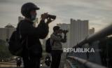 Jurnalis mengambil gambar suasana langit Jakarta di kawasan Kemayoran, Jakarta, Kamis (18/2). (FOTO : Republika/Thoudy Badai)