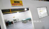 Rumah sakit mini disiagakan di Shelter Gose Covid-19, Bantul, Yogyakarta, Kamis (18/2). RSU PKU Muhammadiyah menyulap lapangan futsal menjadi shelter pasien Covid-19 OTG. Shelter darurat ini memiliki 32 bilik untuk 16 pasien laki-laki serta 16 pasien perempuan. Selain itu, di sini juga dilengkapi rumah sakit mini serta dokter dan empat perawat yang berjaga. (FOTO : Wihdan Hidayat / Republika)