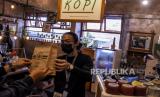 Staf gerai kopi memberikan produk minuman kepada pembeli menggunakan kantong belanja ramah lingkungan di tokonya di The Hallway Kosambi, Pasar Kosambi, Kota Bandung, Kamis (18/2). (FOTO : ABDAN SYAKURA/REPUBLIKA)