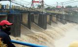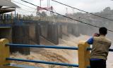 REPUBLIKA.CO.ID, BOGOR -- Petugas melakukan pemantauan saat debit air yang deras, di jembatan Bendung Katulampa, Kota Bogor, Jawa Barat, Jumat (19/2).