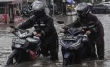 Sejumlah pengendara mendorong motornya saat melintasi banjir di Jalan Caman Raya, Bekasi, Jawa Barat, Jumat (19/2/2021). Menurut data BPBD Kota Bekasi 23 titik banjir di 12 Kecamatan yang tergenang akibat intensitas hujan yang tinggi serta meluapnya kali Cileungsi dan Cikeas. (FOTO : ANTARA / Fakhri Hermansyah)