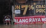 Seorang bocah beristirahat saat banjir menggenangi Jalan Caman Raya, Bekasi, Jawa Barat, Jumat (19/2/2021). Menurut data BPBD Kota Bekasi 23 titik banjir di 12 Kecamatan yang tergenang akibat intensitas hujan yang tinggi serta meluapnya kali Cileungsi dan Cikeas. (FOTO : ANTARA / Fakhri Hermansyah)