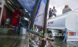 Petugas Palang Merah Indonesia (PMI) mengisi air bersih untuk dapur umum warga terdampak banjir di Pekalongan, Jawa Tengah, Jumat (19/2). (FOTO : ANTARA FOTO/Harviyan Perdana Putra)