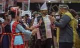 Menteri Pariwisata dan Ekonomi Kreatif (Kemenparekraf) Sandiaga Uno (tengah) didampingi Bupati Kabupaten Dairi Eddy Keleng Ate Berutu (kanan) menari tor tor usai Gerakan Nasional (Gernas) Bangga Buatan Indonesia (BBI) Beli Kreatif Danau Toba, di Paropo, Dairi, Sumatera Utara, Sabtu (20/2). (FOTO : ANTARA/Nova Wahyudi)