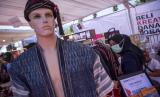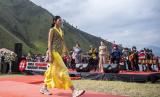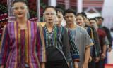 Model mengenakan busana berbahan ulos usai peluncuran Gerakan Nasional (Gernas) Bangga Buatan Indonesia (BBI) Beli Kreatif Danau Toba, di Paropo, Dairi, Sumatera Utara, Sabtu (20/2). (FOTO : ANTARA/Nova Wahyudi)