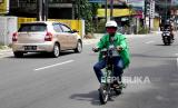 Ojek daring menggunakan sepeda listrik untuk mengantar pesanan makanan di kawasan Seturan, Yogyakarta, Ahad (27/2). Namun, penggunaan sepeda listrik untuk mengantar makanan dan belanja ini masih hanya di beberapa titik. Penggunaan sepeda listrik bisa untuk lima hingga enam pengantaran dengan jarak yang tidak terlalu jauh. Untuk tarif tidak ada perbedaan dengan yang biasa atau sepeda motor. (FOTO : Wihdan Hidayat / Republika)