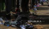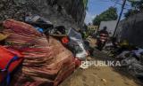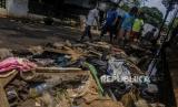 Sampah-sampah sisa banjir yang terdiri dari barang-barang rumah tangga itu disimpan oleh warga di pinggir jalan untuk diangkut petugas kebersihan.