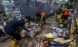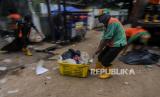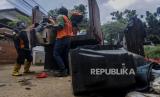 Petugas mengangkut sampah sisa banjir di Jalan Wijaya Timur, Petogogan, Jakarta, Senin (22/2). Sampah-sampah sisa banjir yang terdiri dari barang-barang rumah tangga itu disimpan oleh warga di pinggir jalan untuk diangkut petugas kebersihan. Republika/Putra M. Akbar (FOTO : Republika/Putra M. Akbar)