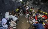 Anak-anak melintas di dekat tumpukan sampah sisa banjir di Jalan Wijaya Timur, Petogogan, Jakarta, Senin (22/2). Sampah-sampah sisa banjir yang terdiri dari barang-barang rumah tangga itu disimpan oleh warga di pinggir jalan untuk diangkut petugas kebersihan. (FOTO : Republika/Putra M. Akbar)