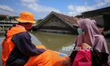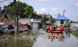 REPUBLIKA.CO.ID, TANGERANG -- Petugas mengevakuasi warga menggunakan perahu karet saat banjir di Total Persada, Periuk, Kota Tangerang, Banten, Senin (22/2/2021).