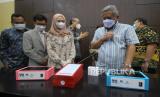 Pencipta alat i-nose C-19 Riyanarto Sarno (tengah) bersama tim dari Institut Teknologi Sepuluh Nopember (ITS) menguji coba i-nose C-19 kepada Ketua Yayasan Rumah Sakit Islam Surabaya (Yarsis) Mohammad Nuh (kedua kanan) saat diserahterimakan di Surabaya, Jawa Timur, Senin (22/2/2021). I-nose C-19 merupakan inovasi teknologi berbasis kecerdasan buatan (artificial intelligence) untuk mendeteksi COVID-19 dari sampel bau keringat yang hasilnya dapat diketahui dengan cepat melalui proses komputasi sekitar 3,5 menit. (FOTO : ANTARA FOTO/Moch Asim)