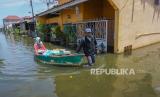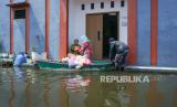 Seperti pedagang sayuran keliling yang menggunakan perahu di Pekalongan, Jawa Tengah, Senin (22/2). Sejak banjir menggenangi Kota Pekalongan, pedagang berinisiatif berjualan menggunakan perahu untuk memudahkan akses melewati banjir.