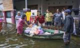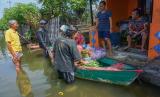 Warga terdampak banjir berbelanja di pedagang sayuran keliling yang menggunakan perahu di Pekalongan, Jawa Tengah, Senin (22/2). (FOTO : ANTARA/Harviyan Perdana Putra)