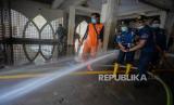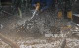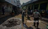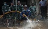 Personel gabungan dari TNI, Polri, petugas Pemadam Kebakaran, PPSU, dan warga sekitar membersihkan endapan lumpur sisa banjir di area Masjid Al-Hidayah, Cipinang Melayu. Jakarta Timur, Senin (22/2). (FOTO : Republika/Thoudy Badai)