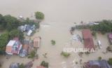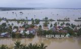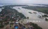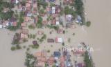 Foto udara banjir di Kampung Babakan Banten, Pebayuran, Kabupaten Bekasi, Jawa Barat, Senin (22/2/2021). Banjir yang disebabkan tanggul Sungai Citarum jebol tersebut mengakibatkan lima desa terisolir selama tiga hari. (FOTO : ANTARA/Fakhri Hermansyah)