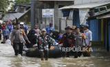 Petugas polisi dan relawan membawa bantuan saat mereka mengarungi air banjir dengan perahu karet di Pebayuran, Bekasi, Jawa Barat, Indonesia, 22 Februari 2021. Hujan deras merusak tanggul sungai Citarum yang menyebabkan lebih dari delapan ribu rumah terendam banjir dan ribuan orang meninggalkan rumah mereka. (FOTO : EPA-EFE/MAST IRHAM)