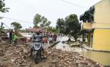 Pengendara motor melintasi jalan yang tertutup material akibat jebolnya tanggul Sungai Citarum di Desa Sumber Urip, Pebayuran, Kabupaten Bekasi, Jawa Barat, Selasa (23/2). (FOTO : ANTARA/Hafidz Mubarak A)