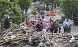 Warga mencari barang-barang yang masih bisa diselamatkan di area rumahnya yang hancur akibat tergerus arus setelah jebolnya tanggul Sungai Citarum di Desa Sumber Urip, Pebayuran, Kabupaten Bekasi, Jawa Barat, Selasa (23/2). (FOTO : ANTARA/Hafidz Mubarak A)