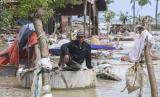 Warga mencari barang-barang yang masih bisa diselamatkan di dekat rumahnya yang rusak tergerus arus akibat jebolnya tanggul Sungai Citarum di Desa Sumber Urip, Pebayuran, Kabupaten Bekasi, Jawa Barat, Selasa (23/2). (FOTO : ANTARA/Hafidz Mubarak A)