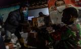 Prajurit TNI dan relawan mendistribusikan bantuan logistik sembako untuk korban bencana angin puting beliung di Balai Desa Karangsono, Kecamatan Mranggen, Kabupaten Demak, Jawa Tengah, Selasa (23/2/2021). Ratusan personel gabungan lintas instansi serta berbagai relawan organisasi masyarakat bersiaga membantu para korban dampak hujan deras disertai angin puting beliung yang terjadi pada Selasa (23/2) sore sekitar pukul 15:00 WIB di desa tersebut. (FOTO : ANTARA/Aji Styawan)