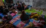 Sejumlah warga terdampak bencana angin puting beliung mengungsi di ruang sekolah taman kanak-kanak, Desa Karangsono, Kecamatan Mranggen, Kabupaten Demak, Jawa Tengah, Selasa (23/2/2021). Menurut data sementara yang dihimpun BPBD Demak hingga Selasa (23/2) pukul 21:15 WIB, sekitar 168 rumah warga, delapan tempat usaha rusak dihantam angin puting beliung dan belasan keluarga terpaksa mengungsi ke sejumlah titik yang disiapkan oleh pihak desa. (FOTO : ANTARA/Aji Styawan)
