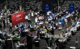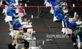 Suasana vaksinasi Covid-19 kepada awak media di Hall Basket Senayan, komplek Gelora Bung Karno, Jakarta, Kamis (25/2). Sebanyak 1.838 wartawan akan menjalani vaksinasi Covid-19 di GBK hari ini. Secara total, terdapat 5.512 orang awak media massa di DKI Jakarta akan mendapatkan vaksin mulai dari hari Rabu (25/2) hingga Sabtu (27/2) mendatang. (FOTO : Republika/Thoudy Badai)