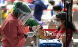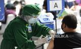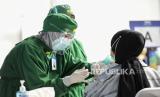 Vaksinator menyuntikkan vaksin Covid-19 kepada awak media di Hall Basket Senayan, komplek Gelora Bung Karno, Jakarta, Kamis (25/2). Sebanyak 1.838 wartawan akan menjalani vaksinasi Covid-19 di GBK hari ini. Secara total, terdapat 5.512 orang awak media massa di DKI Jakarta akan mendapatkan vaksin mulai dari hari Rabu (25/2) hingga Sabtu (27/2) mendatang. Republika/Thoudy Badai (FOTO : Republika/Thoudy Badai)