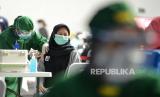 REPUBLIKA.CO.ID, JAKARTA -- Suasana vaksinasi Covid-19 kepada awak media di Hall Basket Senayan, komplek Gelora Bung Karno, Jakarta, Kamis (25/2).